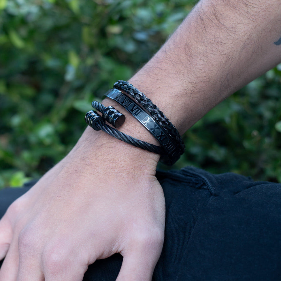 Black Stainless Steel & Rhodium Roman Bracelet Set For Men
