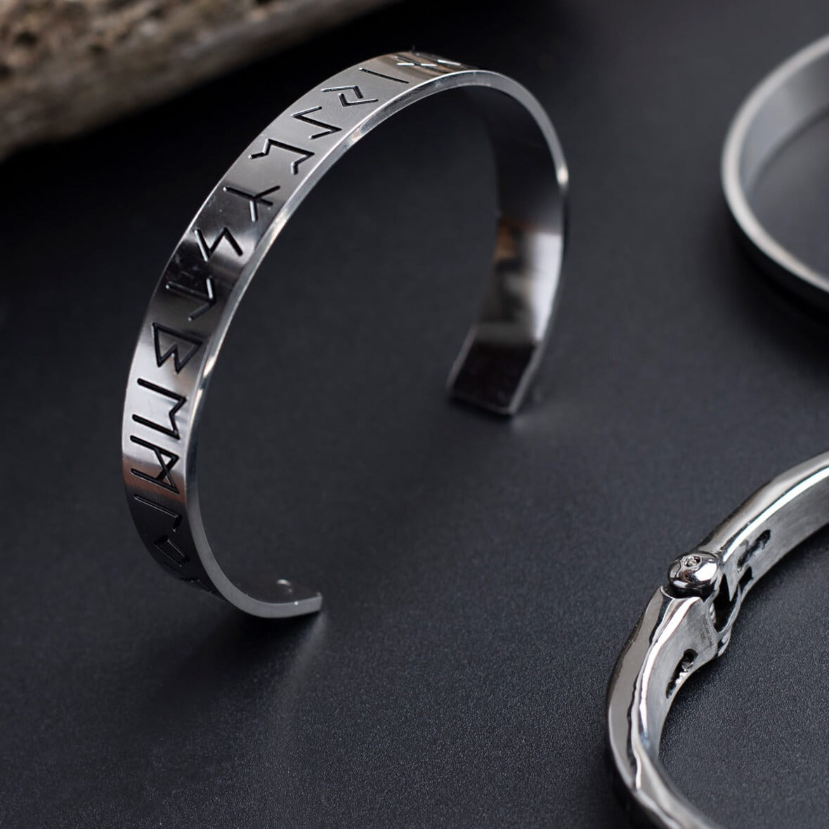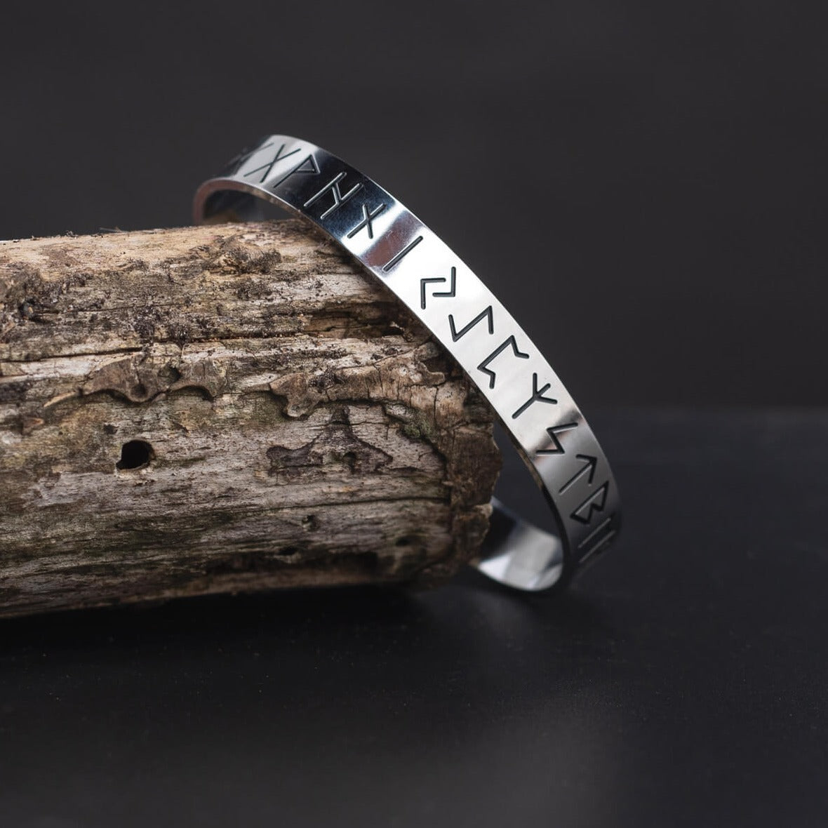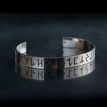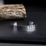 Ein robustes silbernes Wikinger-Armband mit runischen Inschriften auf der Außenseite. Um eine bemerkenswerte Relief- und Designwirkung zu erzielen, wurde es aus hochwertigem Edelstahl von Hand gefertigt.